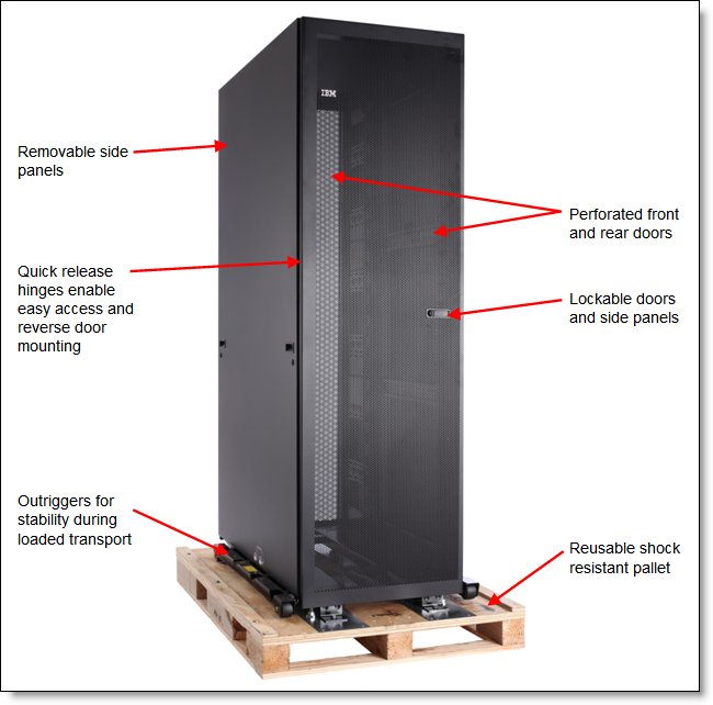 Figure 2 shows the 42U Dynamic Rack on the reusable shock-resistant pallet ready for transport. The figure also shows the outriggers that aid the stability of the rack during movement, especially when the rack is fully loaded. ![]() Figure 2. The 42U Dynamic Rack on the shipping pallet Figure 3 shows the split rear doors plus the three of the six side-wall compartments (pockets) for 1U PDUs and switches. ![]() Figure 3. Rear view of the IBM 42U 1200mm Deep Static Rack, 93614PX Table 2 compares the power specifications of the racks. Table 2. Specifications